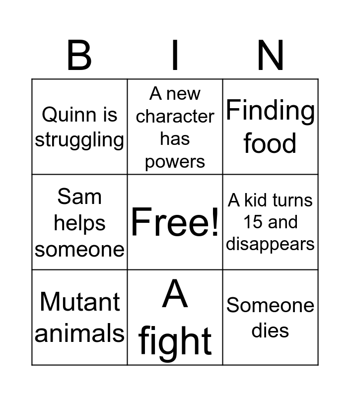 This bingo card has a free space and 11 words: Caine might be evil?, A fight, Someone dies, Mutant animals, A new character has powers, Finding food, A kid turns 15 and disappears, Lana heals someone, Sam helps someone, Quinn is struggling and Astrid has a theory.