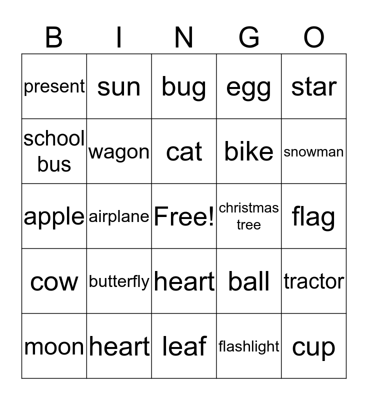 This bingo card has a free space and 34 words: fish, flashlight, globe, horse, cow, wagon, star, moon, sun, dog, cat, bug, pizza, car, christmas tree, snowman, heart, apple, butterfly, ball, heart, book, present, flag, leaf, cup, egg, monkey, bike, school bus, pumpkin, airplane, tractor and flower.