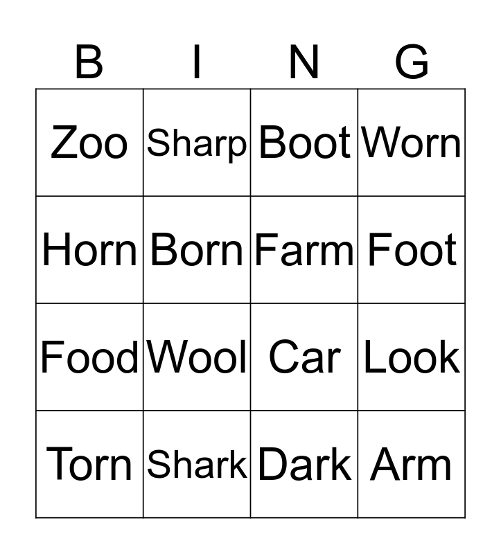This bingo card has 16 words: Shark, Look, Boot, Zoo, Food, Sharp, Car, Dark, Horn, Born, Torn, Worn, Wool, Foot, Farm and Arm.