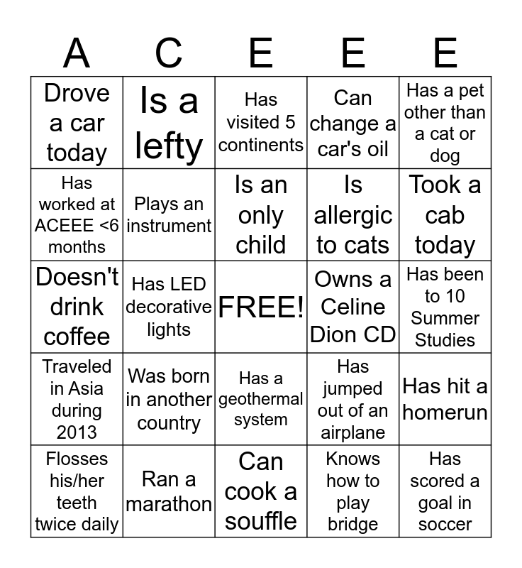 This bingo card has a free space and 24 words: Was born in another country, Ran a marathon, Is an only child, Flosses his/her teeth twice daily, Has a pet other than a cat or dog, Drove a car today, Has worked at ACEEE <6 months, Is a lefty, Owns a Celine Dion CD, Has a geothermal system, Is allergic to cats, Doesn't drink coffee, Has jumped out of an airplane, Has hit a homerun, Plays an instrument, Knows how to play bridge, Has been to 10 Summer Studies, Has visited 5 continents, Took a cab today, Has LED decorative lights, Has scored a goal in soccer, Traveled in Asia during 2013, Can change a car's oil and Can cook a souffle.