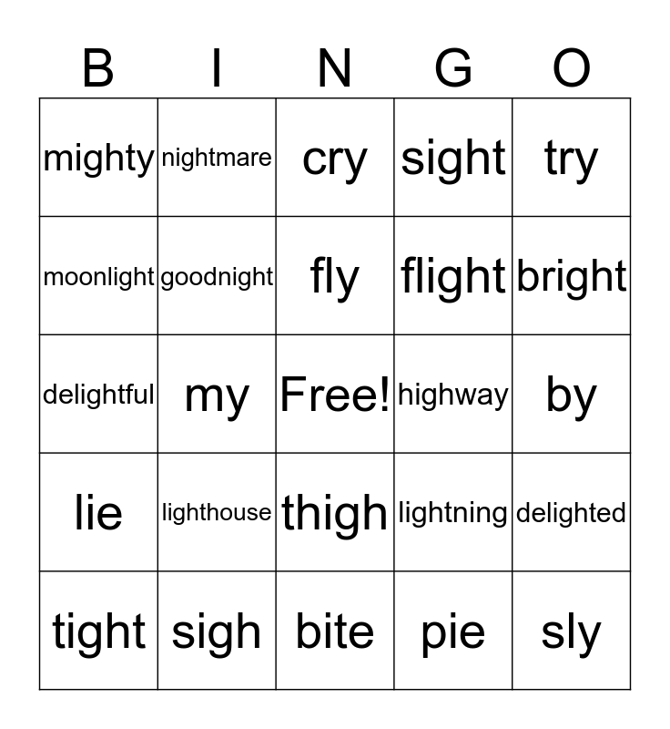 This bingo card has a free space and 24 words: lighthouse, sigh, fly, tight, try, mighty, moonlight, nightmare, highway, thigh, flight, delightful, lightning, delighted, goodnight, pie, by, cry, bright, my, sly, lie, sight and bite.
