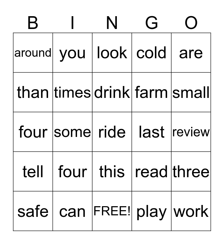 This bingo card has 31 words: FREE!, girl, some, their, around, look, times, read, last, play, review, ride, work, that, small, said, three, four, tell, this, are, have, safe, you, farm, than, cold, four, can, drink and two.