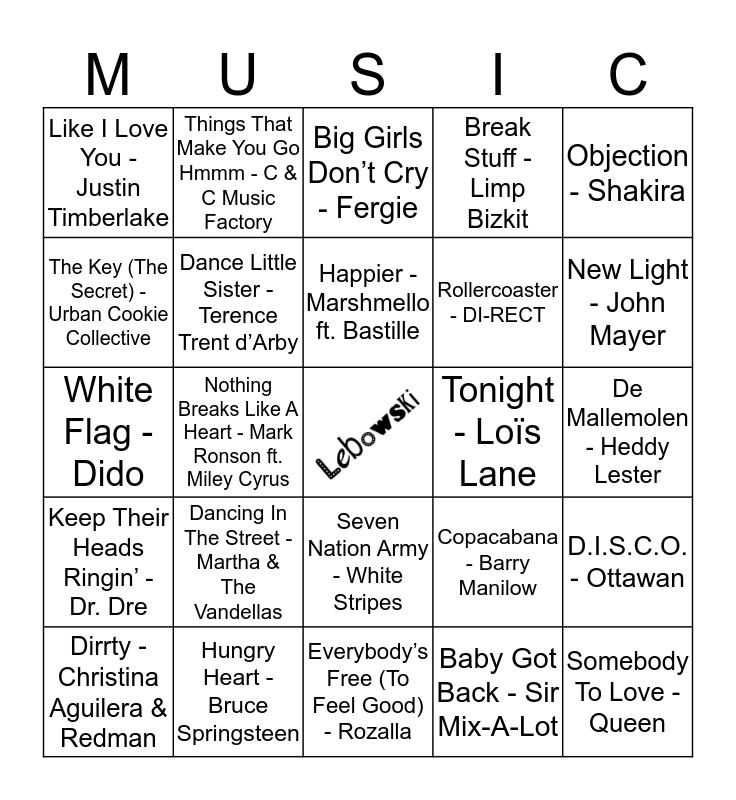 This bingo card has a free space and 24 words: Dancing In The Street - Martha & The Vandellas, Hungry Heart - Bruce Springsteen, Happier - Marshmello ft. Bastille, Dirrty - Christina Aguilera & Redman, Objection - Shakira, Like I Love You - Justin Timberlake, The Key (The Secret) - Urban Cookie Collective, Things That Make You Go Hmmm - C & C Music Factory, Tonight - Loïs Lane, Seven Nation Army - White Stripes, Rollercoaster - DI-RECT, White Flag - Dido, Copacabana - Barry Manilow, D.I.S.C.O. - Ottawan, Dance Little Sister - Terence Trent d’Arby, Baby Got Back - Sir Mix-A-Lot, De Mallemolen - Heddy Lester, Big Girls Don’t Cry - Fergie, New Light - John Mayer, Nothing Breaks Like A Heart - Mark Ronson ft. Miley Cyrus, Somebody To Love - Queen, Keep Their Heads Ringin’ - Dr. Dre, Break Stuff - Limp Bizkit and Everybody’s Free (To Feel Good) - Rozalla.