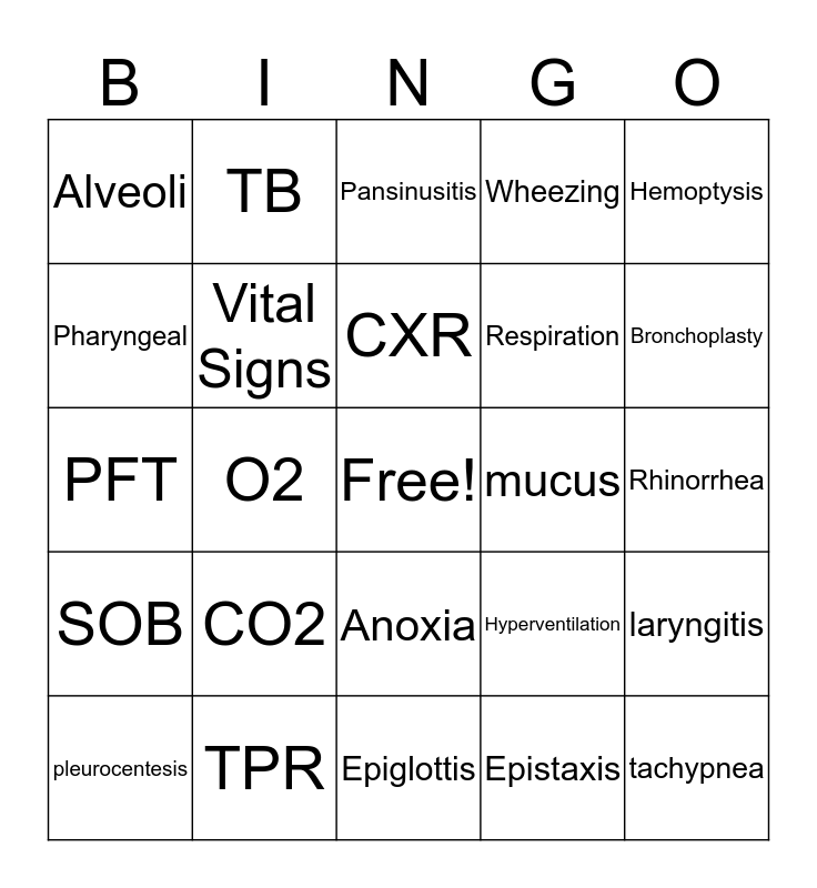 This bingo card has a free space and 31 words: Epiglottis, CPR, O2, ENT, Alveoli, Pansinusitis, Vital Signs, Hyperventilation, mucus, Epistaxis, Rhinorrhea, tachypnea, Brochioles, SIDS, Bronchoplasty, URI, laryngitis, CO2, SOB, Anoxia, Hemoptysis, MDI, pleurocentesis, TB, Respiration, Pharyngeal, Wheezing, PFT, TPR, CXR and COPD.