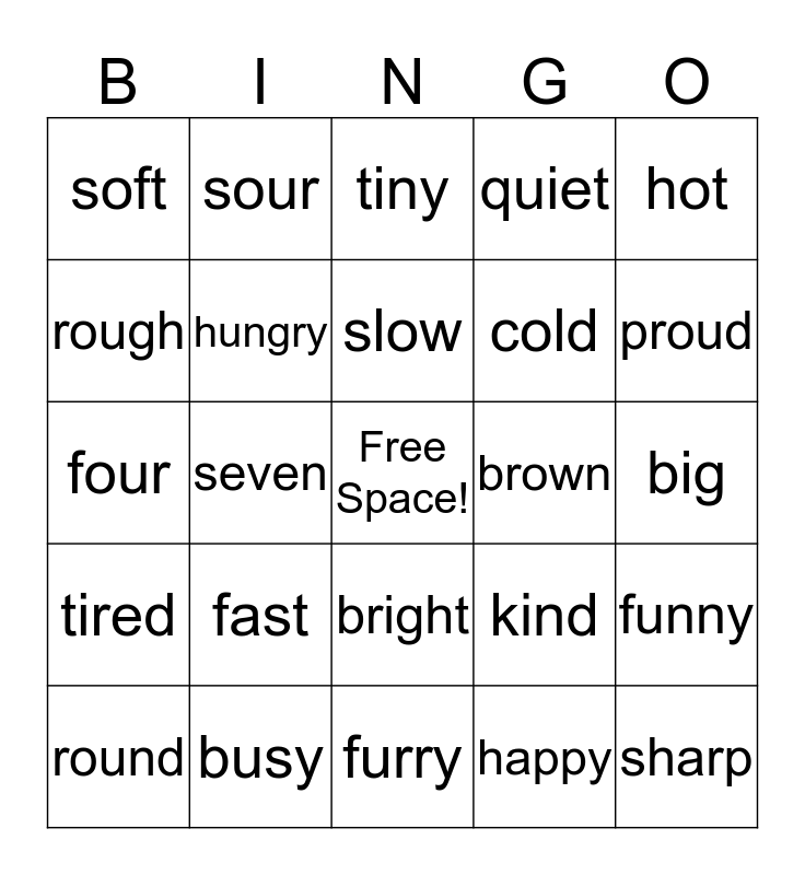 This bingo card has a free space and 24 words: round, fast, slow, happy, hot, soft, sour, tiny, brown, big, four, hungry, kind, funny, rough, busy, furry, quiet, proud, tired, seven, bright, cold and sharp.
