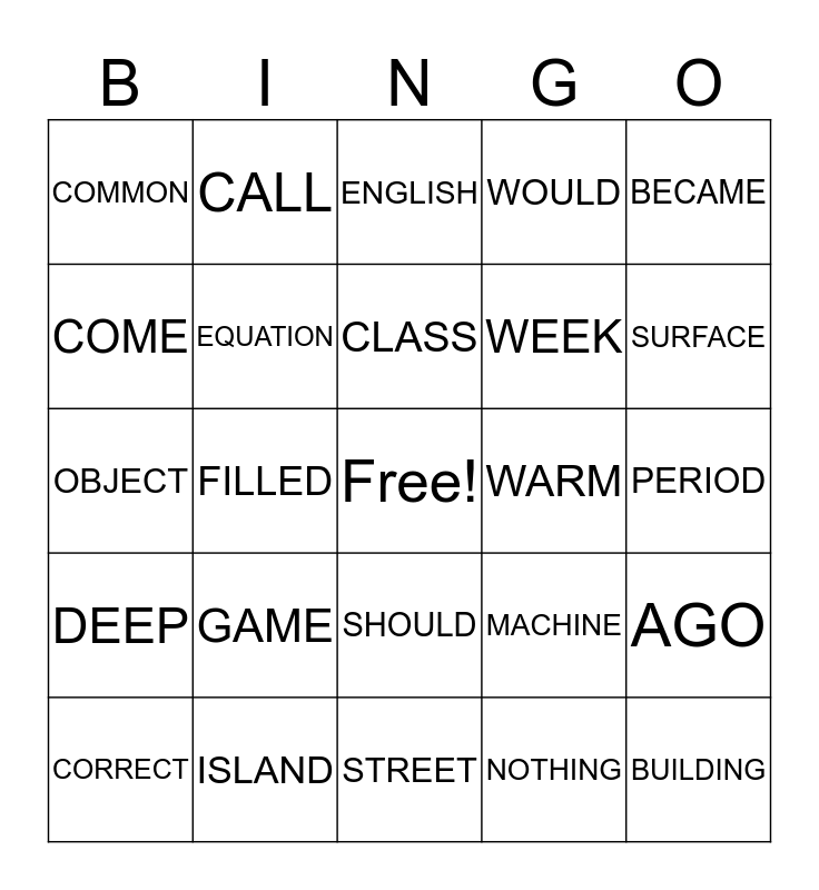 This bingo card has a free space and 29 words: WHEELS, ISLAND, ENGLISH, BRING, BECAME, COMMON, EQUATION, CLASS, WARM, AGO, CORRECT, FILLED, NOTHING, BUILDING, OBJECT, DONE, STREET, MACHINE, SURFACE, DEEP, GAME, KNOWN, WEEK, PERIOD, COME, CALL, SHOULD, WOULD and BUY.