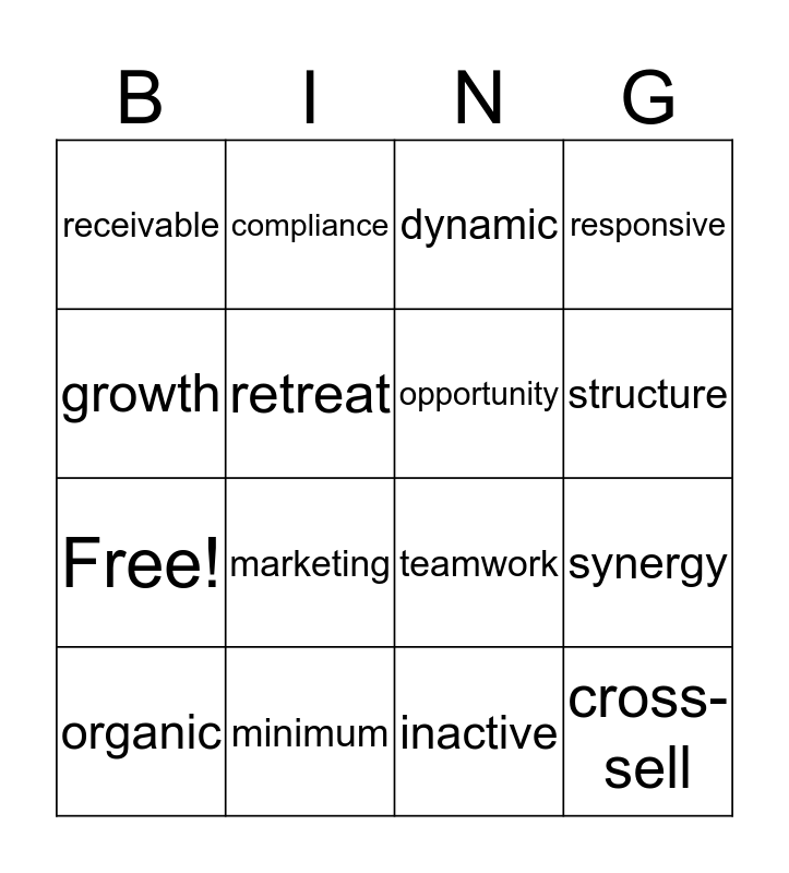 This bingo card has 20 words: synergy, hygiene, dynamic, Hanna, organic, growth, minimum, receivable, Free!, compliance, marketing, teamwork, retreat, cross-sell, opportunity, bonus, structure, responsive, inactive and compensation.