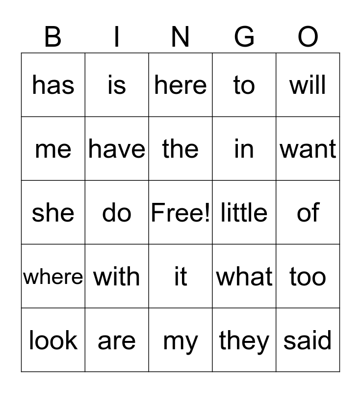 This bingo card has a free space and 30 words: are, at, do, for, has, here, have, it, little, my, of, said, they, this, want, was, what, where, with, will, she, he, is, in, me, to, too, look, the and you.