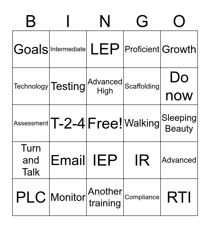 This bingo card has a free space and 29 words: PLC, TEA, T-2-4, ELPS, Goals, LEP, Testing, Email, Walking, Monitor, Sleeping Beauty, RTI, Another training, Compliance, Do now, Appraiser, IEP, Turn and Talk, Growth, Assessment, IR, Expectations, Scaffolding, Technology, Proficient, Intermediate, Advanced, Advanced High and Facilitate.