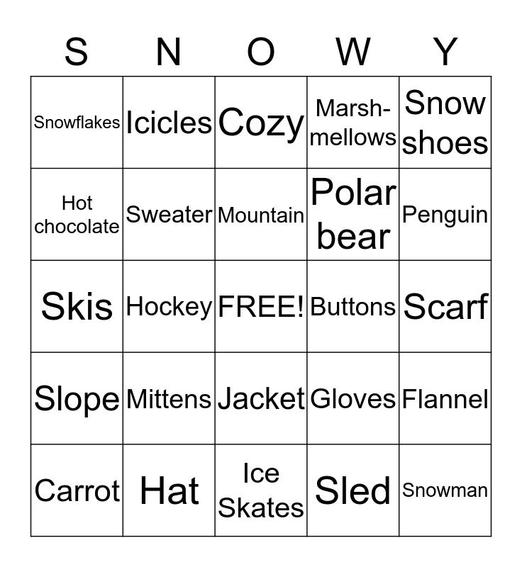 This bingo card has a free space and 24 words: Mittens, Hat, Mountain, Carrot, Snow shoes, Snowflakes, Hot chocolate, Icicles, Buttons, Jacket, Polar bear, Skis, Gloves, Flannel, Sweater, Sled, Scarf, Cozy, Penguin, Hockey, Snowman, Slope, Marsh- mellows and Ice Skates.