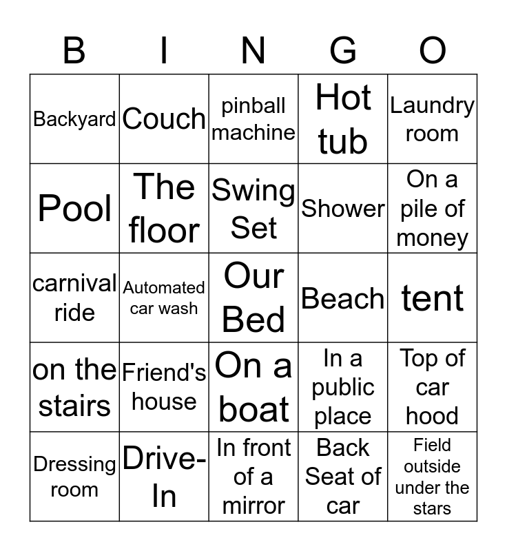 This bingo card has a free space and 49 words: Parents house, Field outside under the stars, Balcony of hotel room, In front of a mirror, Friend's house, Kitchen counter, Couch, Closet, Pool, Guest room, The floor, Hot tub, Top of car hood, In a public place, Office chair, Movie theater, Swing Set, Beach, Pool table, Laundry room, Automated car wash, Back Seat of car, Backyard, Shower, In the woods, On a pile of money, Dressing room, football field, On a boat, on the stairs, plane, bar/ restaurant bathroom, Taxi, supply closet, Drive-In, locker room, garage, desk, tent, library, own bathroom sink, air mattress, kitchen floor, park, carnival ride, pinball machine, trampoline, photo booth and hammock.