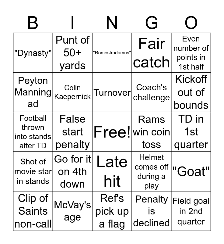 This bingo card has a free space and 24 words: Go for it on 4th down, McVay's age, Turnover, Clip of Saints non-call, Even number of points in 1st half, "Dynasty", Peyton Manning ad, Punt of 50+ yards, Rams win coin toss, Late hit, Coach's challenge, Football thrown into stands after TD, Helmet comes off during a play, "Goat", Colin Kaepernick, Penalty is declined, TD in 1st quarter, "Romostradamus", Kickoff out of bounds, False start penalty, Field goal in 2nd quarter, Shot of movie star in stands, Fair catch and Ref's pick up a flag.