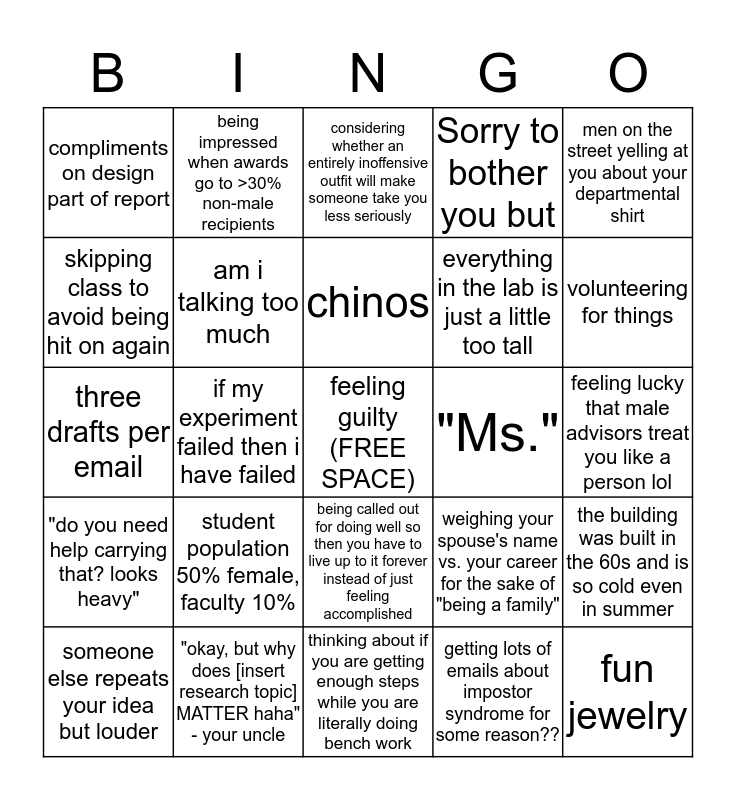 This bingo card has a free space and 24 words: student population 50% female, faculty 10%, "okay, but why does [insert research topic] MATTER haha" - your uncle, chinos, someone else repeats your idea but louder, men on the street yelling at you about your departmental shirt, compliments on design part of report, skipping class to avoid being hit on again, being impressed when awards go to >30% non-male recipients, "Ms.", being called out for doing well so then you have to live up to it forever instead of just feeling accomplished, everything in the lab is just a little too tall, three drafts per email, weighing your spouse's name vs. your career for the sake of "being a family", the building was built in the 60s and is so cold even in summer, am i talking too much, getting lots of emails about impostor syndrome for some reason??, feeling lucky that male advisors treat you like a person lol, considering whether an entirely inoffensive outfit will make someone take you less seriously, volunteering for things, if my experiment failed then i have failed, fun jewelry, "do you need help carrying that? looks heavy", Sorry to bother you but and thinking about if you are getting enough steps while you are literally doing bench work.