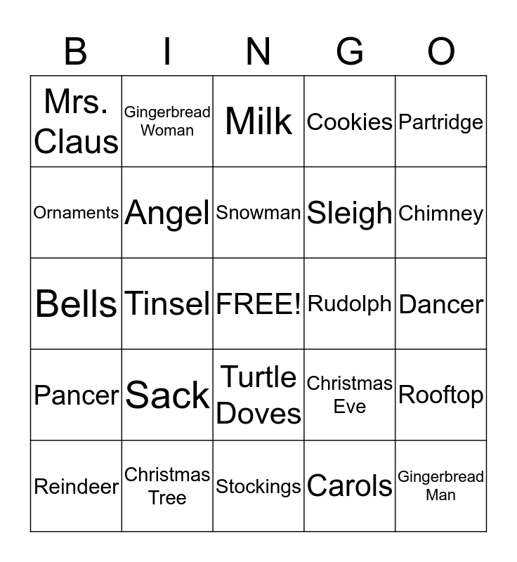 This bingo card has a free space and 24 words: Sack, Christmas Tree, Snowman, Reindeer, Partridge, Mrs. Claus, Ornaments, Gingerbread Woman, Rudolph, Turtle Doves, Sleigh, Bells, Christmas Eve, Rooftop, Angel, Carols, Dancer, Milk, Chimney, Tinsel, Gingerbread Man, Pancer, Cookies and Stockings.
