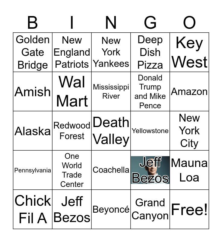 This bingo card has 1 images and 27 words: Jeff Bezos, Free!, Donald Trump and Mike Pence, Beyoncé, Amish, New York Yankees, New England Patriots, Pennsylvania, Yellowstone, Mauna Loa, Alaska, Deep Dish Pizza, Chick Fil A, Jeff Bezos, Amazon, Philly Cheesesteak, Wal Mart, Mississippi River, One World Trade Center, Golden Gate Bridge, New York City, Grand Canyon, Redwood Forest, Death Valley, Coachella, Key West and Mt. Rushmore.
