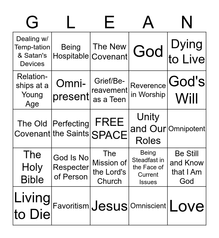 This bingo card has a free space and 24 words: God Is No Respecter of Person, Favoritism, Grief/Be- reavement as a Teen, Living to Die, Dying to Live, Dealing w/ Temp-tation & Satan's Devices, Relation-ships at a Young Age, Being Hospitable, Unity and Our Roles, The Mission of the Lord's Church, Reverence in Worship, The Old Covenant, Being Steadfast in the Face of Current Issues, Be Still and Know that I Am God, Omni-present, Omniscient, Omnipotent, The New Covenant, God's Will, Perfecting the Saints, Love, The Holy Bible, God and Jesus.