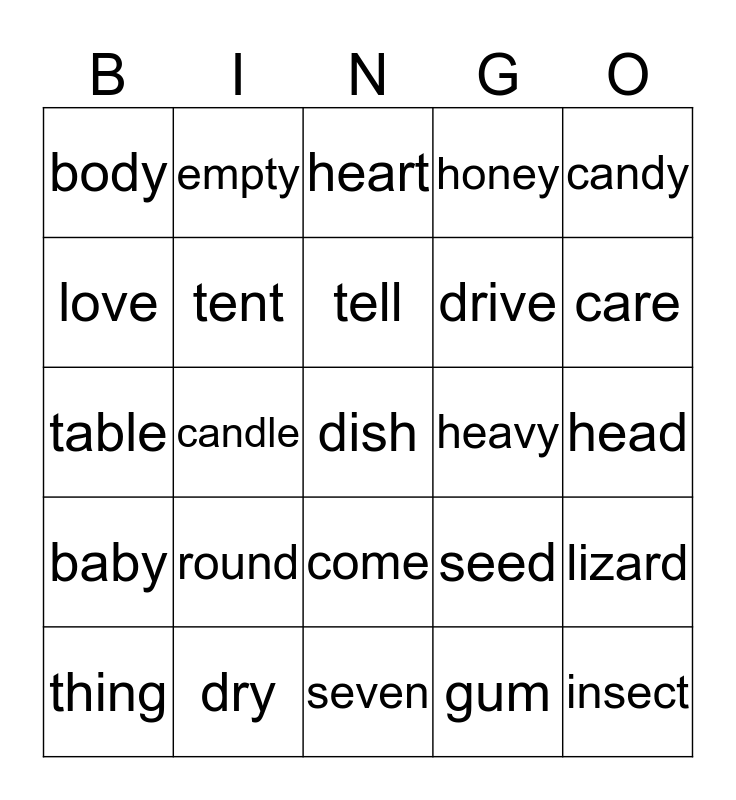 This bingo card has 25 words: round, seven, tell, thing, candy, body, love, empty, heavy, come, drive, table, seed, lizard, tent, insect, head, heart, care, candle, dish, dry, baby, honey and gum.