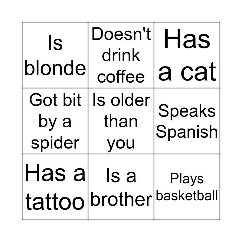 This bingo card has 12 words: Is a parent, Plays basketball, Is older than you, Speaks Spanish, Doesn't drink coffee, Has a cat, Is a brother, Lives with their parents, Is blonde, Got bit by a spider, Has a tattoo and Intolerant to cheese.