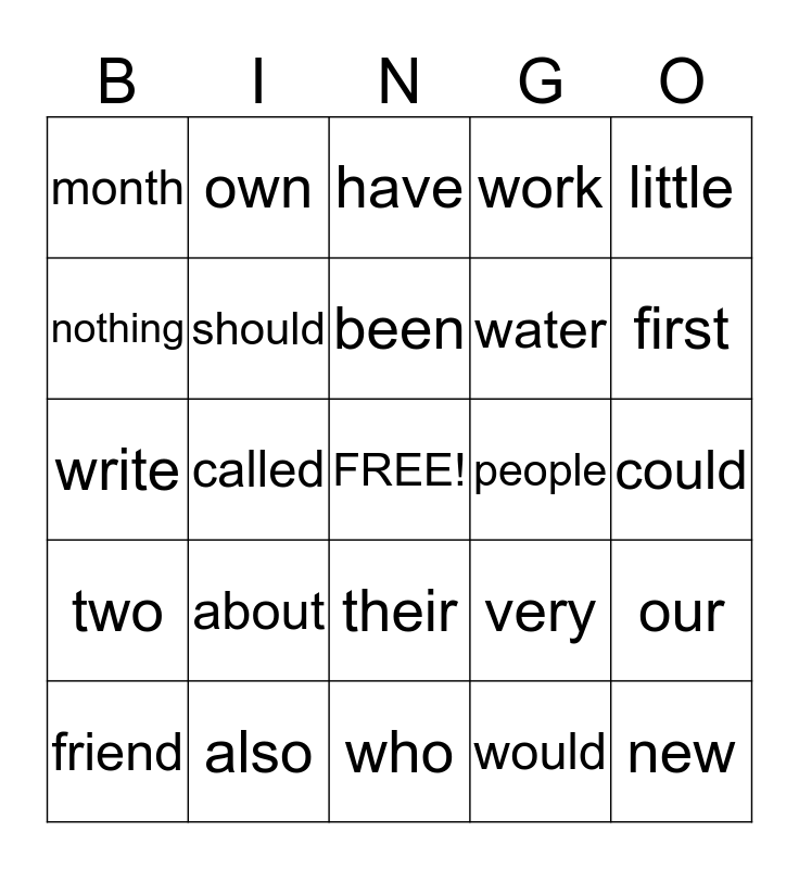This bingo card has a free space and 24 words: about, also, been, friend, little, month, nothing, own, people, their, water, write, very, our, should, would, could, have, first, called, new, two, work and who.