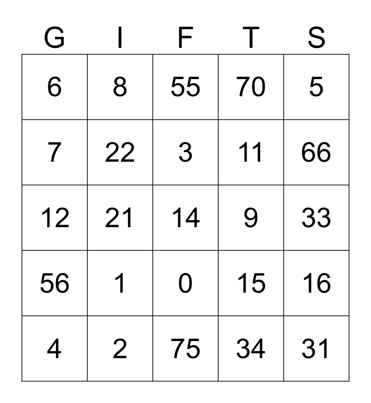 This bingo card has a free space and 24 words: 1, 2, 3, 4, 5, 6, 7, 8, 9, 0, 11, 12, 15, 16, 22, 34, 33, 55, 66, 21, 31, 56, 70 and 75.