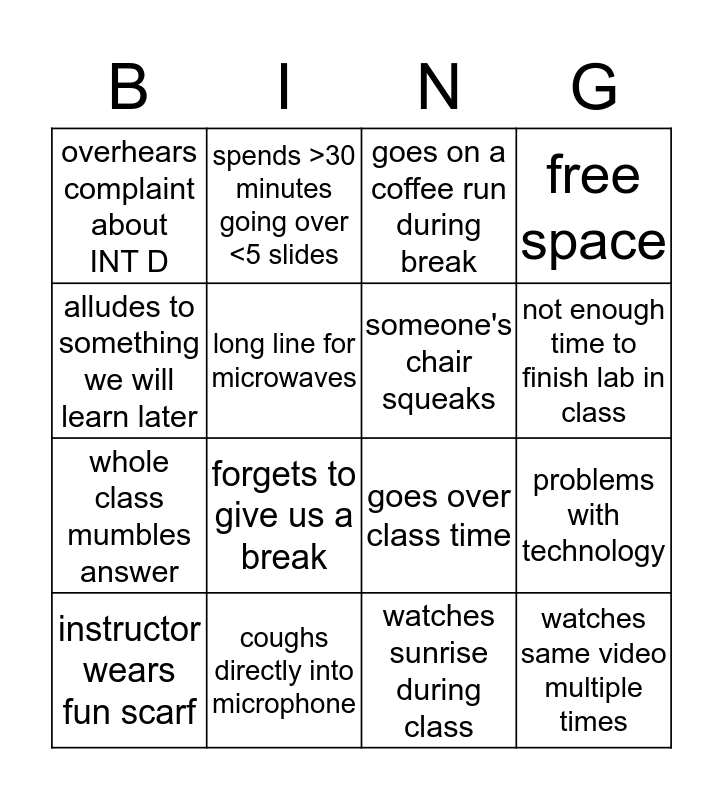 This bingo card has 16 words: coughs directly into microphone, problems with technology, goes on a coffee run during break, overhears complaint about INT D, whole class mumbles answer, spends >30 minutes going over <5 slides, goes over class time, watches sunrise during class, alludes to something we will learn later, long line for microwaves, instructor wears fun scarf, free space, forgets to give us a break, not enough time to finish lab in class, someone's chair squeaks and watches same video multiple times.