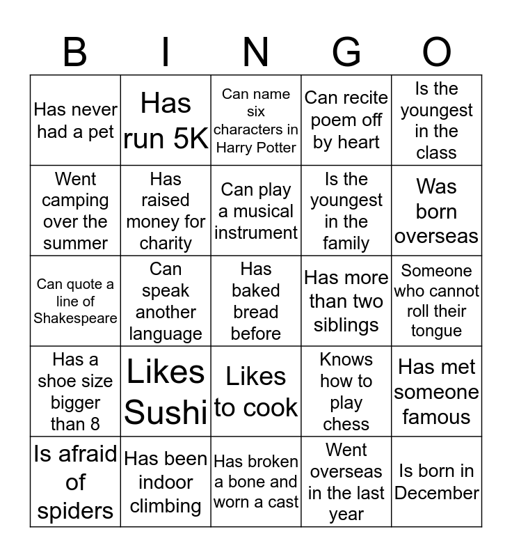 This bingo card has 25 words: Likes Sushi, Has broken a bone and worn a cast, Can play a musical instrument, Is afraid of spiders, Is the youngest in the class, Has never had a pet, Went camping over the summer, Has run 5K, Has more than two siblings, Likes to cook, Is the youngest in the family, Can quote a line of Shakespeare, Knows how to play chess, Has met someone famous, Has raised money for charity, Is born in December, Someone who cannot roll their tongue, Can name six characters in Harry Potter, Was born overseas, Can speak another language, Has baked bread before, Has been indoor climbing, Has a shoe size bigger than 8, Can recite poem off by heart and Went overseas in the last year.