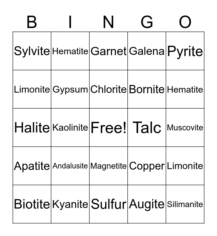 This bingo card has a free space and 29 words: Biotite, Barite, Kaolinite, Fluorite, Sylvite, Garnet, Gypsum, Andalusite, Talc, Kyanite, Muscovite, Silimanite, Sulfur, Augite, Hematite, Quartz, Magnetite, Apatite, Pyrite, Halite, Copper, Siderite, Bornite, Limonite, Galena, Hematite, Limonite, Chlorite and Graphite.
