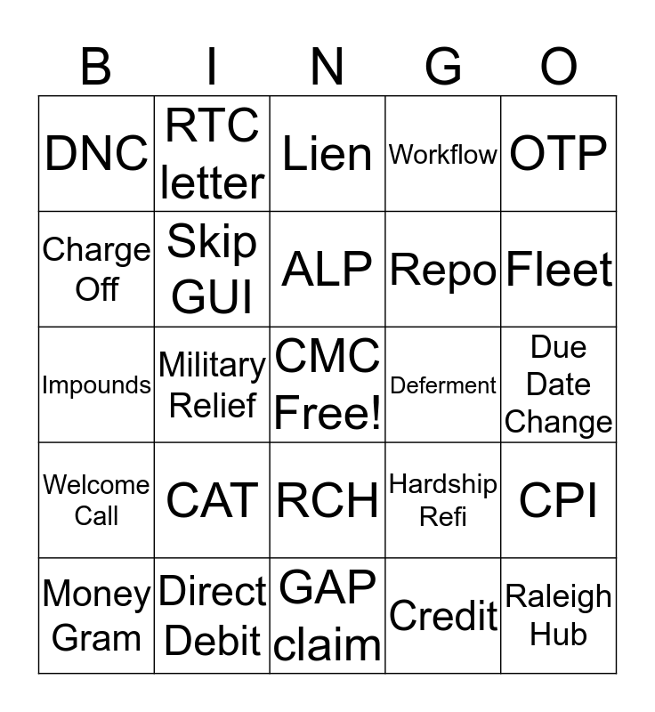 This bingo card has a free space and 24 words: CAT, Direct Debit, ALP, Money Gram, OTP, DNC, Charge Off, RTC letter, Deferment, RCH, Repo, Impounds, Hardship Refi, CPI, Skip GUI, Credit, Due Date Change, Lien, Fleet, Military Relief, Raleigh Hub, Welcome Call, Workflow and GAP claim.