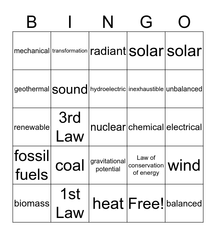 This bingo card has 30 words: 1st Law, 2nd Law, 3rd Law, force, mechanical, radiant, sound, gravitational potential, chemical, heat, electrical, nuclear, Free!, balanced, unbalanced, inertia, Law of conservation of energy, fossil fuels, coal, solar, renewable, non-renewable, transformation, inexhaustible, geothermal, solar, wind, biomass, hydroelectric and petroleum.