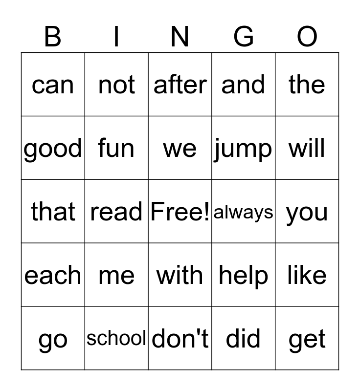 This bingo card has a free space and 24 words: go, me, we, did, the, can, not, after, always, you, that, fun, help, like, good, school, don't, and, will, each, read, with, jump and get.