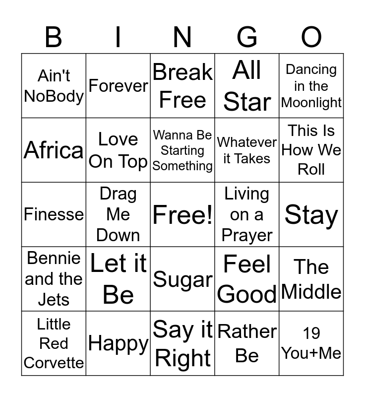 This bingo card has a free space and 24 words: Let it Be, Happy, Wanna Be Starting Something, Little Red Corvette, Dancing in the Moonlight, Ain't NoBody, Africa, Forever, Living on a Prayer, Sugar, Whatever it Takes, Finesse, Feel Good, The Middle, Love On Top, Rather Be, Stay, Break Free, This Is How We Roll, Drag Me Down, 19 You+Me, Bennie and the Jets, All Star and Say it Right.