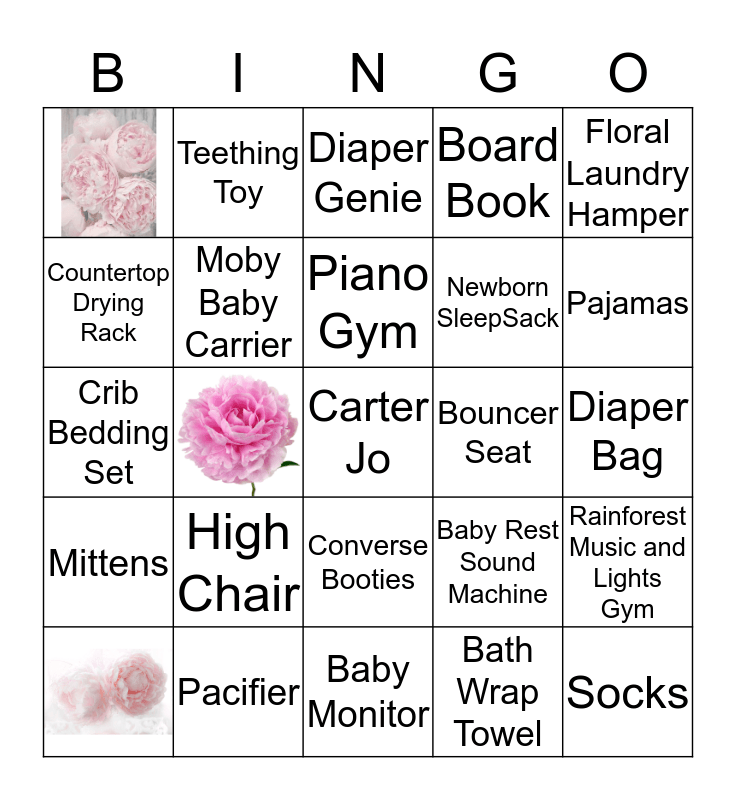 This bingo card has 5 images, a free space and 24 words: Diaper Genie, Moby Baby Carrier, High Chair, Bouncer Seat, Pacifier, Diaper Bag, Socks, Baby Monitor, Bath Wrap Towel, Pajamas, Headband, Converse Booties, Mittens, Floral Laundry Hamper, Crib Bedding Set, Baby Rest Sound Machine, Beach Baby Pop Up Shade, Newborn SleepSack, Countertop Drying Rack, Board Book, Teething Toy, Rainforest Music and Lights Gym, Piano Gym and Bottles.