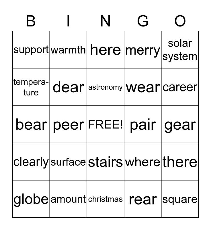 This bingo card has a free space and 24 words: surface, amount, astronomy, globe, solar system, support, tempera- ture, warmth, pair, stairs, wear, bear, where, there, dear, rear, gear, here, career, peer, square, clearly, merry and christmas.
