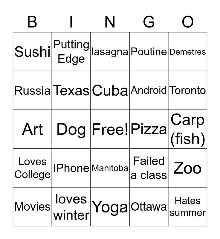 This bingo card has a free space and 24 words: IPhone, loves winter, Cuba, Movies, Demetres, Sushi, Russia, Putting Edge, Pizza, Manitoba, Android, Art, Failed a class, Zoo, Texas, Ottawa, Carp (fish), lasagna, Toronto, Dog, Hates summer, Loves College, Poutine and Yoga.