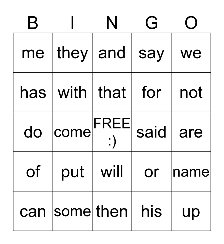 This bingo card has a free space and 29 words: can, look, come, like, me, and, with, put, said, some, are, up, then, his, not, you, will, of, we, do, or, did, for, has, say, they, name, that and by.