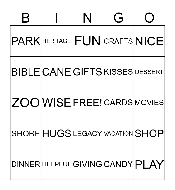This bingo card has a free space and 29 words: KISSES, HELPFUL, FUN, BABYSIT, NICE, PARK, CANE, GIFTS, CARDS, SHOP, DINNER, WISE, CANDY, PLAY, ZOO, LOVE, GIVING, VACATION, DESSERT, SHORE, HUGS, PARTIES, KISSES, MOVIES, BIBLE, HERITAGE, LEGACY, CRAFTS and SMILE.