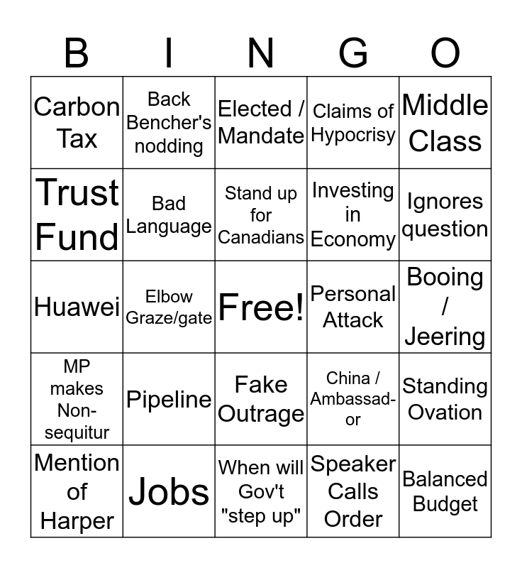 This bingo card has a free space and 24 words: Pipeline, Jobs, Stand up for Canadians, Mention of Harper, Middle Class, Carbon Tax, Trust Fund, Back Bencher's nodding, Personal Attack, Fake Outrage, Investing in Economy, Huawei, China / Ambassad-or, Standing Ovation, Bad Language, Speaker Calls Order, Booing / Jeering, Elected / Mandate, Ignores question, Elbow Graze/gate, Balanced Budget, MP makes Non-sequitur, Claims of Hypocrisy and When will Gov't "step up".
