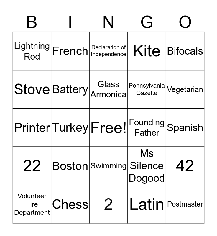 This bingo card has a free space and 24 words: Boston, Chess, Glass Armonica, Volunteer Fire Department, Bifocals, Lightning Rod, Stove, French, Founding Father, Swimming, Pennsylvania Gazette, Printer, Ms Silence Dogood, 42, Battery, Latin, Spanish, Declaration of Independence, Vegetarian, Turkey, Postmaster, 22, Kite and 2.