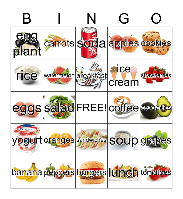 This bingo card has 24 images, a free space and 24 words: oranges, peppers, breakfast, banana, cookies, egg plant, rice, carrots, coffee, sandwiches, ice cream, eggs, soup, grapes, watermelon, lunch, avocados, soda, strawberries, salad, tomatoes, yogurt, apples and burgers.