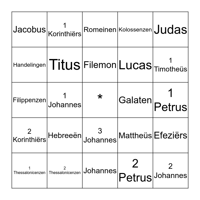 This bingo card has a free space and 27 words: Mattheüs, Marcus, Lucas, Johannes, Handelingen, Romeinen, 1 Korinthiërs, 2 Korinthiërs, Galaten, Efeziërs, Filippenzen, Kolossenzen, 1 Thessalonicenzen, 2 Thessalonicenzen, 1 Timotheüs, 2 Timotheüs, Titus, Filemon, Hebreeën, Jacobus, 1 Petrus, 2 Petrus, 1 Johannes, 2 Johannes, 3 Johannes, Judas and Openbaring.