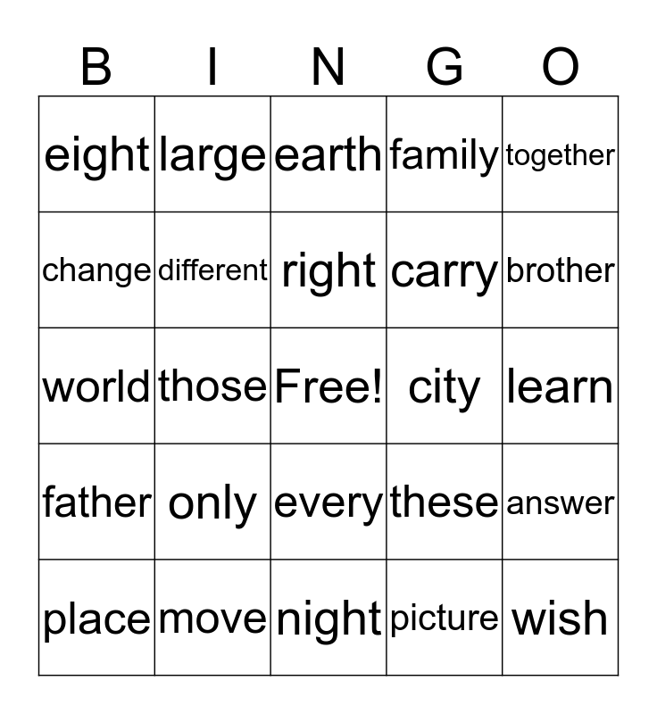 This bingo card has a free space and 24 words: only, move, right, place, together, eight, change, large, city, every, carry, world, these, answer, different, picture, learn, earth, brother, those, wish, father, family and night.