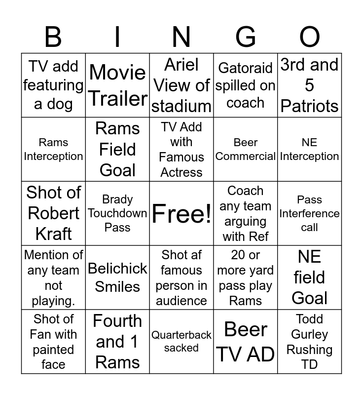 This bingo card has a free space and 24 words: Belichick Smiles, Fourth and 1 Rams, TV Add with Famous Actress, Shot of Fan with painted face, 3rd and 5 Patriots, TV add featuring a dog, Rams Interception, Movie Trailer, Coach any team arguing with Ref, Shot af famous person in audience, Beer Commercial, Shot of Robert Kraft, 20 or more yard pass play Rams, NE field Goal, Rams Field Goal, Beer TV AD, Pass Interference call, Ariel View of stadium, NE Interception, Brady Touchdown Pass, Todd Gurley Rushing TD, Mention of any team not playing., Gatoraid spilled on coach and Quarterback sacked.