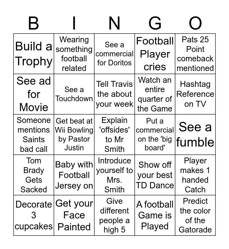 This bingo card has 30 words: Get your Face Painted, TV calls Tom Brady the G.O.A.T, Get beat at Wii Bowling by Pastor Justin, Drink a soda with 3 or more flavors, Build a Trophy, See a commercial for Doritos, See a Touchdown, Introduce yourself to Mrs. Smith, Put a commercial on the 'big board', Give different people a high 5, See a fumble, Explain 'offsides' to Mr Smith, A football Game is Played, Predict the color of the Gatorade, Hashtag Reference on TV, Celebrity on TV, Show off your best TD Dance, Tom Brady Gets Sacked, Baby with Football Jersey on, Pats 25 Point comeback mentioned, Someone mentions Saints bad call, Brought a friend, Wearing something football related, Watch an entire quarter of the Game, See ad for Movie, Football Player cries, Player makes 1 handed Catch, Decorate 3 cupcakes, Tell Travis the about your week and Give Steve Sherber a fist bump.