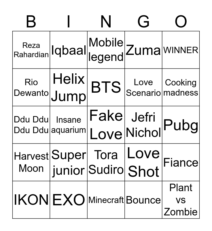 This bingo card has a free space and 24 words: Super junior, EXO, BTS, IKON, WINNER, Reza Rahardian, Rio Dewanto, Iqbaal, Jefri Nichol, Tora Sudiro, Love Scenario, Ddu Ddu Ddu Ddu, Love Shot, Fiance, Helix Jump, Bounce, Pubg, Mobile legend, Cooking madness, Insane aquarium, Plant vs Zombie, Harvest Moon, Zuma and Minecraft.