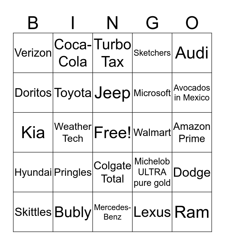 This bingo card has a free space and 24 words: Skittles, Pringles, Jeep, Lexus, Audi, Verizon, Coca-Cola, Turbo Tax, Walmart, Amazon Prime, Kia, Toyota, Michelob ULTRA pure gold, Dodge, Doritos, Bubly, Mercedes-Benz, Sketchers, Avocados in Mexico, Hyundai, Weather Tech, Colgate Total, Microsoft and Ram.