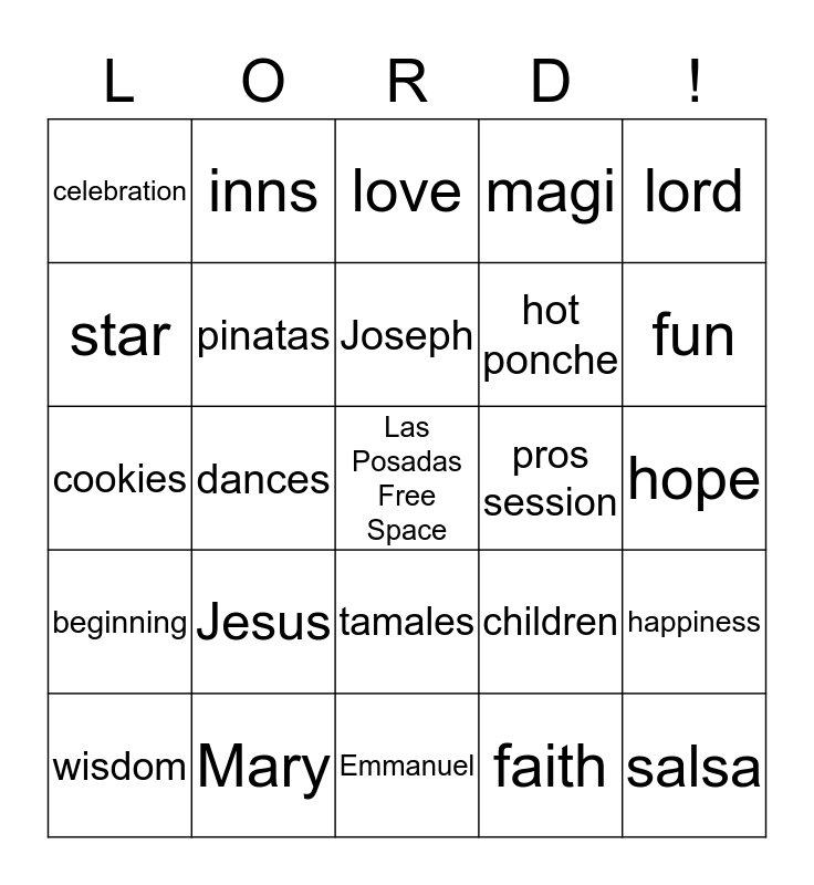 This bingo card has a free space and 24 words: Jesus, Mary, Joseph, wisdom, lord, celebration, star, inns, pros session, tamales, hot ponche, cookies, children, happiness, pinatas, faith, hope, love, fun, dances, salsa, beginning, magi and Emmanuel.
