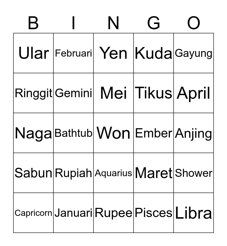 This bingo card has a free space and 24 words: Rupiah, Januari, Mei, Capricorn, Gayung, Ular, Ringgit, Februari, Ember, Aquarius, Tikus, Naga, Maret, Shower, Gemini, Pisces, Anjing, Yen, April, Bathtub, Libra, Sabun, Kuda and Rupee.