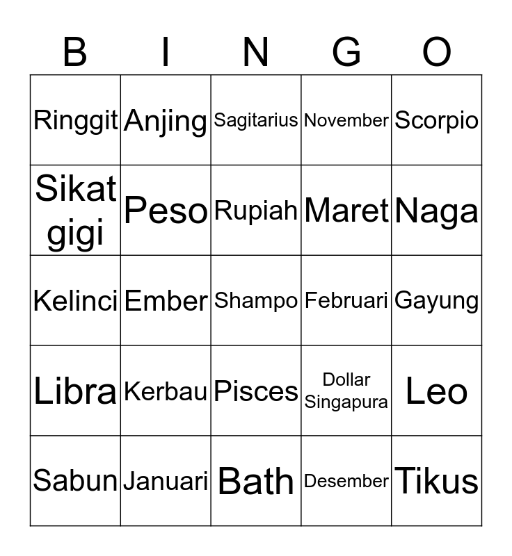 This bingo card has a free space and 24 words: Kerbau, Januari, Rupiah, Sabun, Scorpio, Ringgit, Sikat gigi, Anjing, Februari, Pisces, Maret, Kelinci, Dollar Singapura, Leo, Peso, Desember, Gayung, Sagitarius, Naga, Ember, Tikus, Libra, November and Bath.
