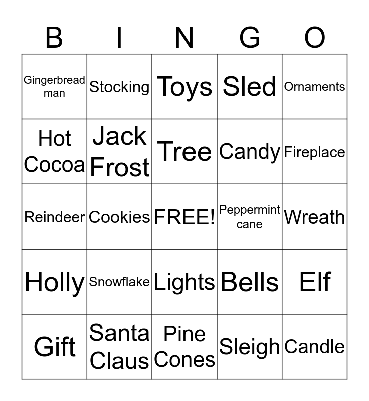 This bingo card has a free space and 24 words: Snowflake, Santa Claus, Tree, Gift, Ornaments, Gingerbread man, Hot Cocoa, Stocking, Peppermint cane, Lights, Candy, Reindeer, Bells, Elf, Jack Frost, Sleigh, Wreath, Toys, Fireplace, Cookies, Candle, Holly, Sled and Pine Cones.