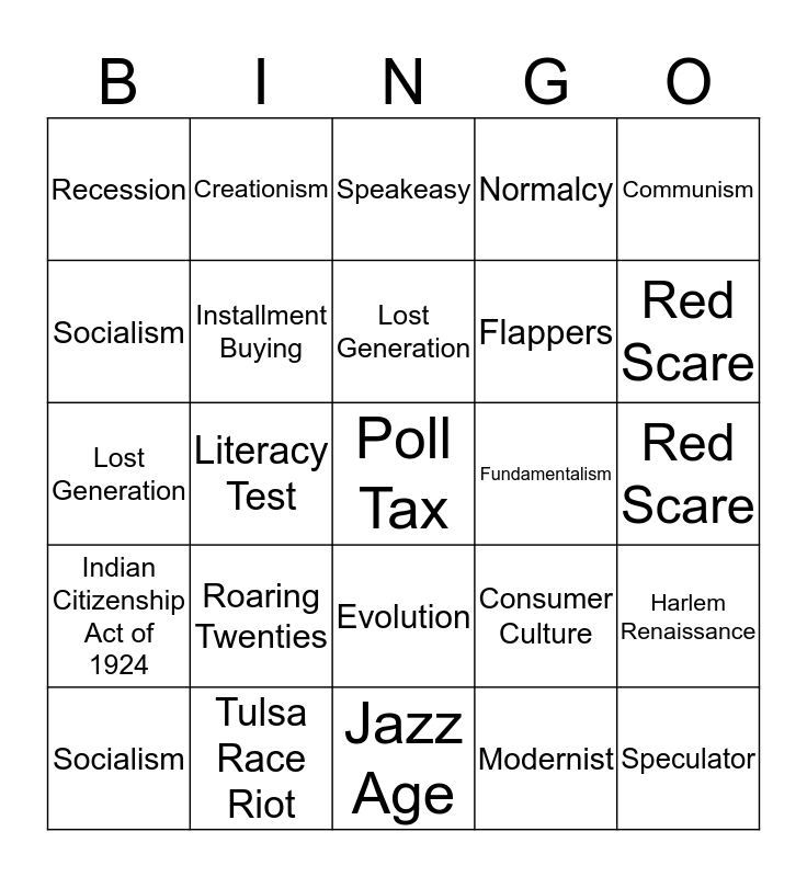 This bingo card has 25 words: Roaring Twenties, Jazz Age, Lost Generation, Socialism, Communism, Recession, Socialism, Creationism, Fundamentalism, Evolution, Flappers, Lost Generation, Consumer Culture, Harlem Renaissance, Installment Buying, Speculator, Red Scare, Speakeasy, Red Scare, Literacy Test, Poll Tax, Tulsa Race Riot, Indian Citizenship Act of 1924, Normalcy and Modernist.